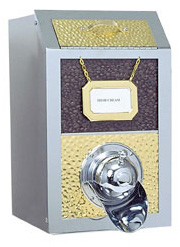 These are solid steel coffee bins built to be sturdy and rugged. This coffee bin will hold about 35 pounds of coffee beans. And these coffee bins have their loading ports on the front of the bins. The front-loading door is made to match your choice of face plate. The plating for these coffee bins can be copper, brass, or chrome - all done with a "hammered finish." A matching name tag holder is included, so that you can write the name of the coffee on a label, and insert it.