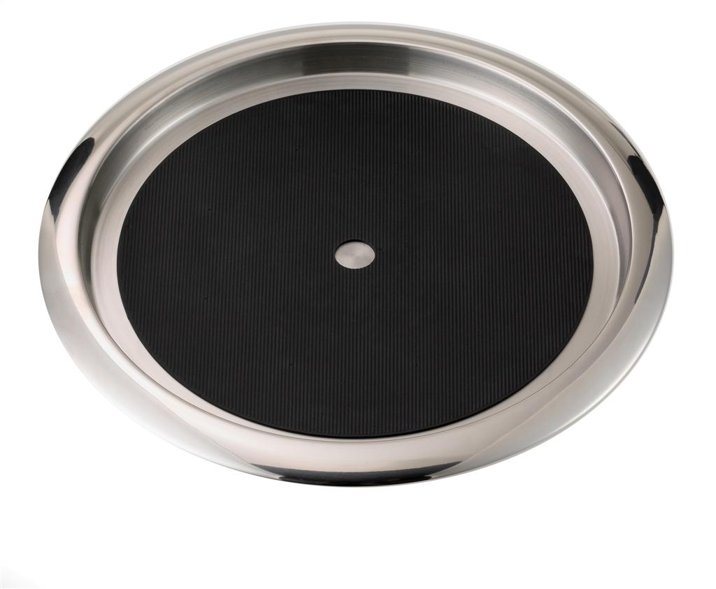 Delux serving trays are made from 18/8 stainless steel, and feature a choice of non-slip options. Serving tray can be ordered with a solid rubber inside (main picture), or with a removable rubber insert (see inset photo), or with permanent dotted rubber grips (see inset photo).Trays have a 14" outer diameter, and an 11.5" diameter inner serving surface. Trays are stackable.
