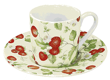Beautiful strawberry plant floral design on porcelain. Note that floral pattern covers entire saucer. Made in Germany.